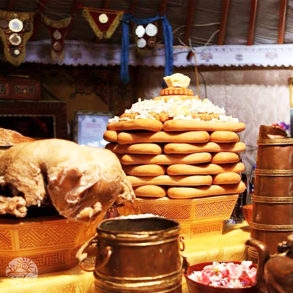 Dans certaines régions de Mongolie, les familles brûlent des bougies à l’autel ce jour-là. Les Mongols visitent également les familles pour échanger des cadeaux et effectuer une traditionnelle salutation zolgokh en se tenant par les coudes. Il est courant de voir des gens en costumes mongols nationaux portant khadag—un bleu, des linges de soie. Après un somptueux dîner avec buuz, queues de moutons et mouton, les gens socialisent et boivent airag – une boisson alcoolisée faite de lait de cheval fermenté.